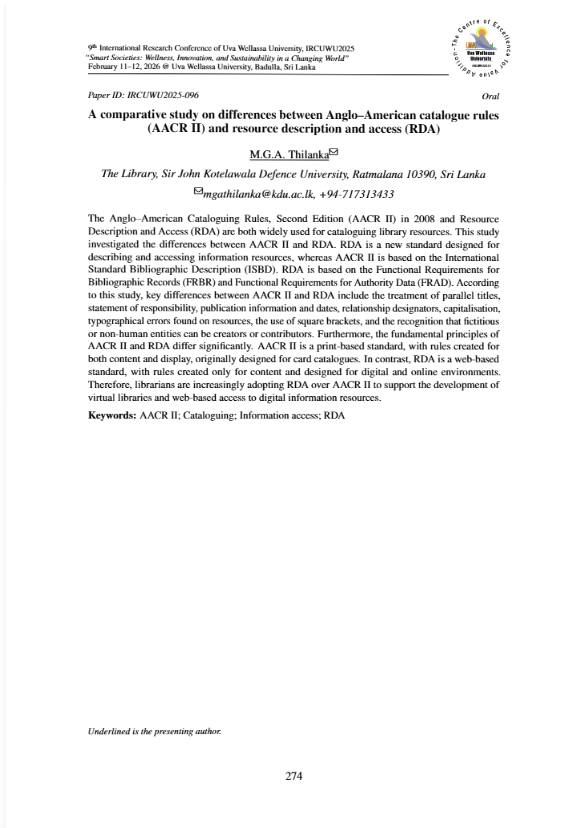 Anglo–American Catalogue Rules II in 2008 and Resource Description and Access are basically used to catalogue. This study investigates differences between AACR II and RDA. Resource Description and Access is a new standard for describing and accessing knowledge. AACR depends on the ISBD standard, and RDA was based on Functional Requirements for Bibliographic Records (FRBR) and Functional Requirements for Authority Data (FRAD). According to this study, it can be identified differences of the catalogue rules such as parallel titles, statement of responsibility, publication information and dates, relationship designators, capitalization, treatment of typos or errors found on the resource, square brackets, and fictitious entities and non-human entities can be creators or contributors. As well, the fundamentals of AACR II and RDA are different. Mainly, AACR II is a printed source; rules are created for both content and display and designed for card catalogues. RDA is an online source and web-based one; rules are created only for the content and designed for a digital world. Therefore, Librarians have been focusing attention on RDA rules rather than AACR II to develop a future virtual library concept concerning web-based description and access to the digital world.